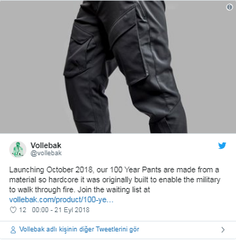 Londra merkezli Vollebak erkek giyim markası, geleceğin erkek kıyafetlerini üretiyor. Parlak montlar, kanlı kamuflaj tişörtlerden sonra şimdi de 100 yıl giyilebilecek pantolonlar.