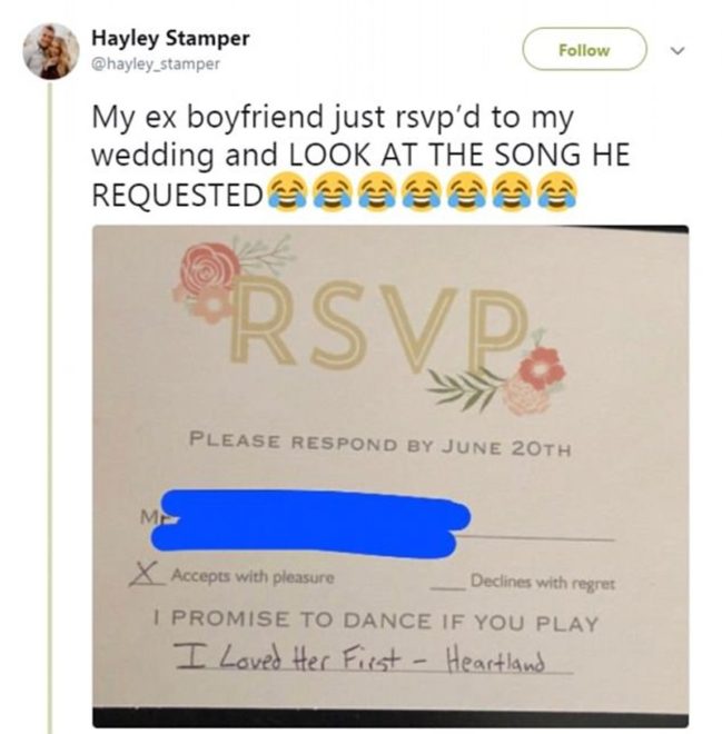 1 yıl önce ayrıldığı eski sevgilisi Thomas Hoefener’e de davetiye gönderen Hayley, kağıdın üzerine katılım bilgisi ve şarkı önerisi seçenekleri ekledi. ‘Bu şarkıyı çalarsan seninle dans edeceğim’ notuyla şarkı önerisi istenen davetiyeyi alan Hoefener esprili bir yanıt verdi.