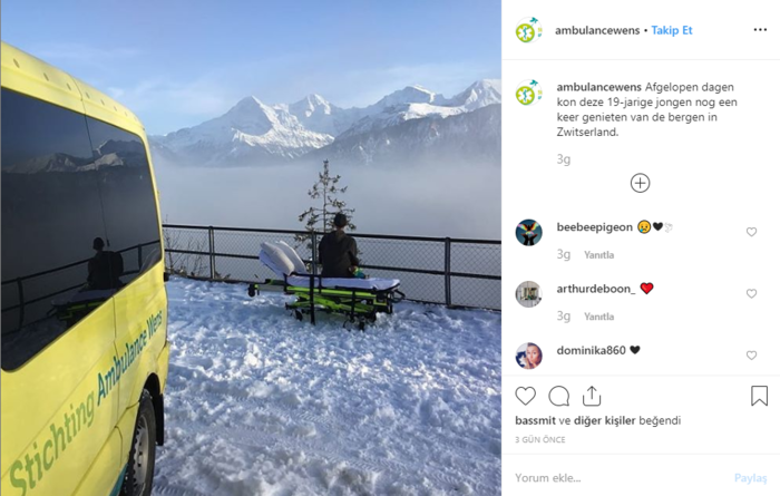 Hollanda’da yaşayan 19 yaşındaki genç kansere yakalandı. Hastalık ilerledi ve kanser hücreleri gencin tüm vücuduna yayıldı. Doktorlar ‘Artık yapacağımız bir şey kalmadı’ dedi.Genç yaşında kansere yakalanan gencin son bir isteği vardı. O da karlarla kaplı İsviçre Alpler’ine doya doya bakmaktı.Hollanda’da faaliyet gösteren bir ambulans şirketi 19 yaşındaki gencin son isteğini yerine getirdi.Özel ambulansla onu İsviçre Alpler’inin sınırına getiren şirket, ona helikopterle havada tur da attırdı.