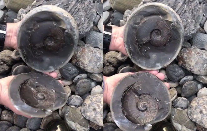 İngiltere’nin Yorkshire bölgesindeki Sandsend sahilinde yürüyüşe çıkan Aaron Smith isimli bir genç, tesadüf eseri golden canonball (altın gülle) adı verilen yerel bir taşa rastladı. Taşı ortadan ikiye ayıran fosil avcısı, gördükleri karşısında şaşkınlığını gizleyemedi