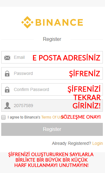 Açılan sayfada aşağıdaki resimde görüldüğü gibi alanları eksiksiz doldurmanız gerekiyor. Bu adımdan sonra binance’ye üye olmuş oluyorsunuz…