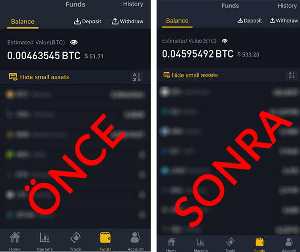 Ekonomi editörlerimiz 2 aylık süreçte grubun yaptığı paylaşımları ve analizlerini inceledi. Söylenilen seviyelerde alım ve satım yaptığınız sürece gelirinizi defalarca kez katlamanız mümkün. Editörlerimizin oluşturduğu hesabın 2 ay önceki miktarı ve şimdiki miktarını sizlerle aşağıda paylaşıyoruz. Ancak belirtmekte fayda var. Ekibimiz sürekli olarak bütün para birimlerini alıp satmamıştır. Verilen kripto para tüyolarının sadece %50’lik bir kısmına yetişip işlem yapılmıştır. İddia ediyoruz ki bütün sinyallere girebilseydik bu miktar çok daha fazla olabilirdi.