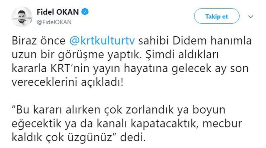 Avukat-Yazar Fidel Okan sosyal medya hesabından yayınladığı mesajında kanalın sahibiyle görüştüklerini belirterek, “Biraz önce @krtkulturtv sahibi Didem hanımla uzun bir görüşme yaptık. Şimdi aldıkları kararla KRT’nin yayın hayatına gelecek ay son vereceklerini açıkladı! ‘Bu kararı alırken çok zorlandık ya boyun eğecektik ya da kanalı kapatacaktık, mecbur kaldık çok üzgünüz’ dedi” ifadelerini kullandı.