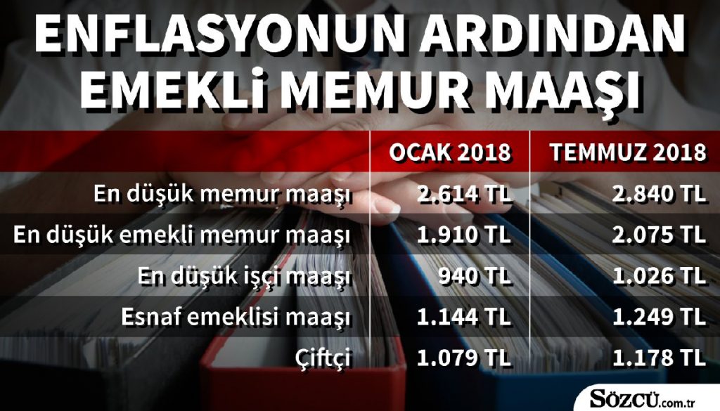 Sene başında yüzde 4 zam alan memur ve memur emeklileri zamdan yüzde 5,17 puan fazla olan enflasyon farkını temmuz ayında alacak. Temmuzda yansıtılacak toplam zam enflasyon farkı ve artı olarak daha önce kararlaştırılan yüzde 3,5 olacak. Yani maaşlar yüzde 9’a yakın zamlanmış olacak.(Sözcü)
