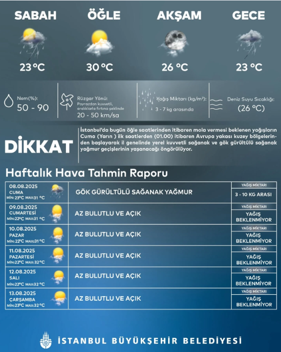 Afet İşleri Daire Başkanlığı AKOM 7 Ağustos hava durumu raporunda İstanbul için sağanak uyarısını güncelledi.