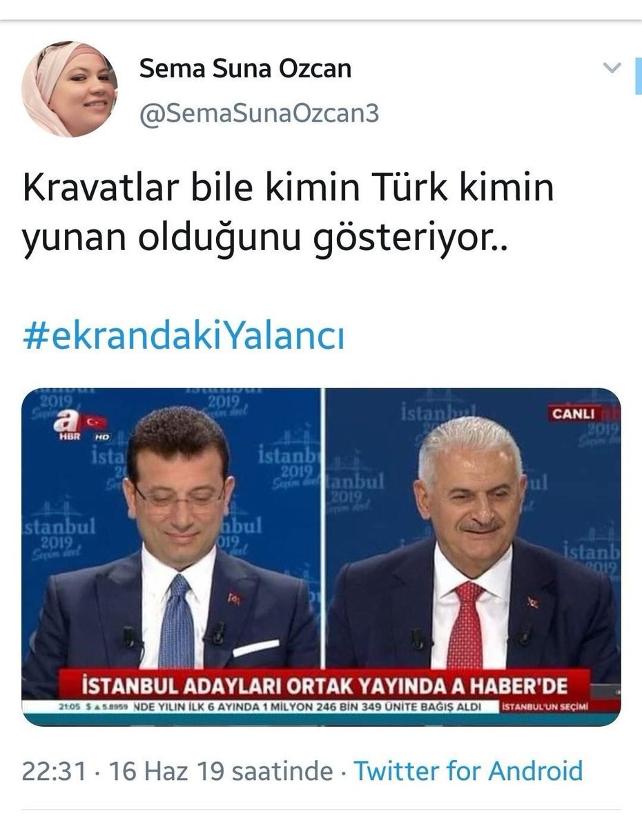 İstanbul Büyükşehir Belediyesi’nin seçilmiş Başkanı Ekrem İmamoğlu’nun Trabzonlu olmasından dolayı AKP’li bazı siyasetçiler, ‘Pontus ve ‘Rum’ söylemlerini sürdürüyor. Son olarak AKP Esenler Kandın Kolları İlçe Başkan Yardımcısı Sema Suna Özcan, sosyal medya hesabından Ekrem İmamoğlu ve Binali Yıldırım’ın katıldığı ortak programdan bir görsel paylaşarak İmamoğlu’nun kravat seçimini ‘Yunan olmak’la bağdaştırdı. Özcan, paylaşımında, “Kravatlar bile kimin Türk kimin Yunan olduğunu gösterdi.” ifadesini kullandı. Özcan daha sonra bu paylaşımını sildi.