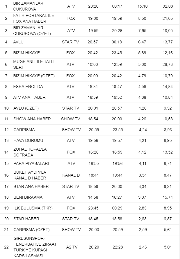 Avlu, Bir Zamanlar Çukurova, Çarpışma ve Bizim Hikaye reyting rekabeti…