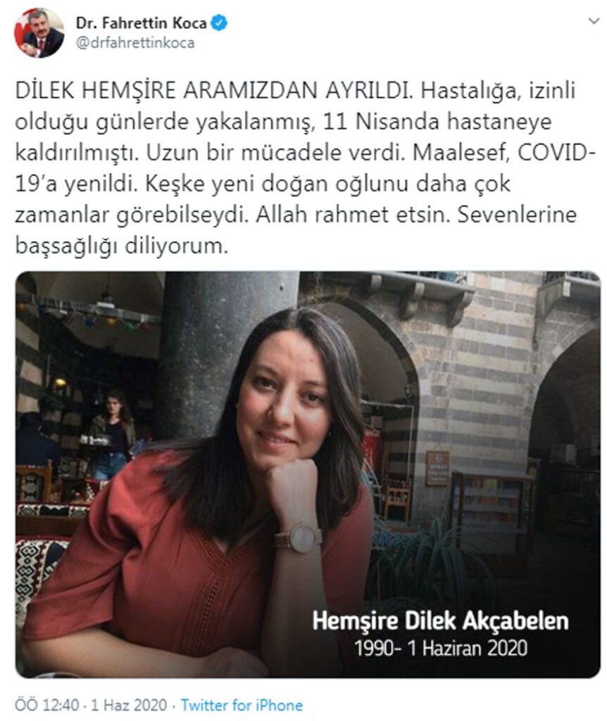 Sağlık Bakanı Fahrettin Koca, corona virüsüne yakalanan ve 34 haftalık bebeği sezaryenle alınan hemşire Dilek Akçabelen’in hayatını kaybettiğini duyurdu.