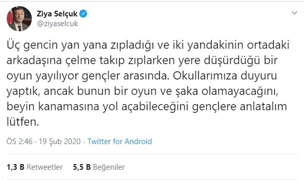 Milli Eğitim Bakanı Ziya Selçuk, Twitter hesabından yaptığı açıklamada gençler arasında beyin kanamasına yol açabilecek tehlikeli bir oyunun yayıldığını belirterek, oyunun oynanmaması konusunda uyarıda bulundu.