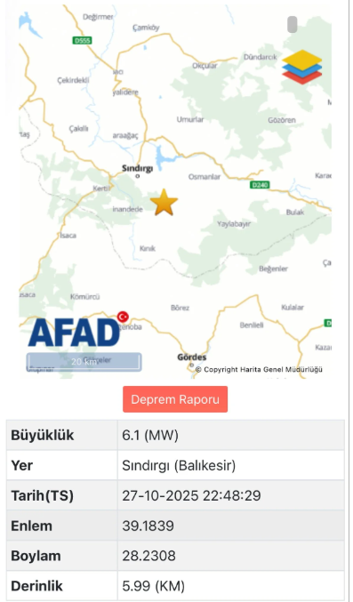 AFAD, Balıkesir’in Sındırgı ilçesinde 6,1 büyüklüğünde deprem meydana geldiğini bildirdi. Deprem İstanbul, İzmir, Bursa, Aydın ve diğer çevre illerden de hissedildi.