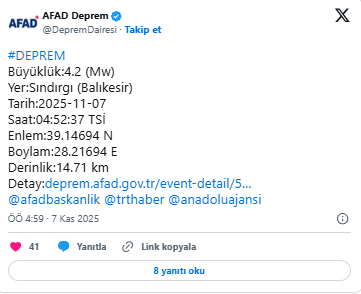 Afet ve Acil Durum Yönetimi Başkanlığı (AFAD), saat 04,52’de merkez üssü Balıkesir’in Sındırgı ilçesi olan 4,2 büyüklüğünde bir deprem meydana geldiğini duyurdu.