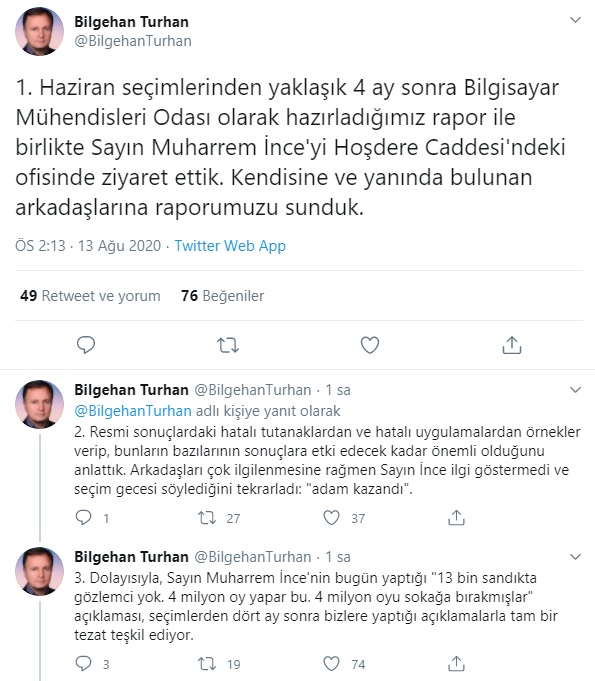 Haziran 2018’deki Cumhurbaşkanlığı seçimleri için “4 milyon oyu CHP sokağa bırakmış” diyen Muharrem İnce’ye Yüksek Bilgisayar Mühendisi Bilgehan Turhan’dan yanıt geldi. Turhan, yaptığı açıklamada, seçimden sonra hatalı seçim tutanaklarının bazılarının sonuçlara etki edecek kadar önemli olduğunu da vurgulamak üzere İnce’ye rapor olarak sunduklarını ancak İnce’nin buna ilgi göstermediğini dile getirdi.