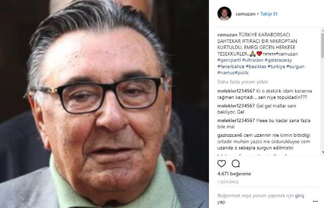 Instagram hesabından Aydın Doğan’ın fotoğrafını da kullanarak bir mesaj yayımlayan Cem Uzan, “Türkiye karaborsacı sahtekar iftiracı bir mikroptan kurtuldu. Emeği geçen herkese teşekkürler” dedi.