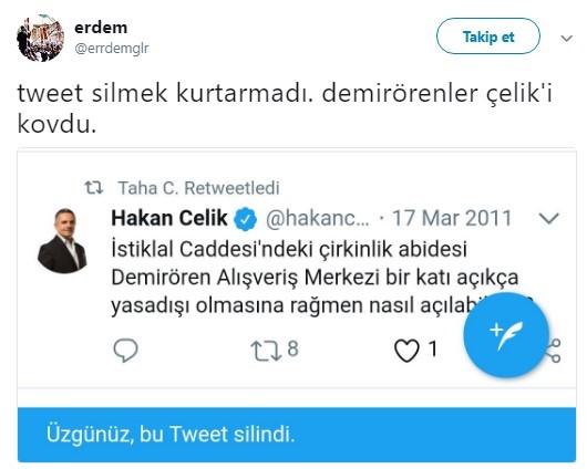 Hakan Çelik’in Doğan Medya’yı Demirören Grubu aldıktan sonra Demirören’lerin İstiklal Caddesindeki AVM’siyle ilgili attığı tweeti silmesi tartışmalara neden olmuştu.