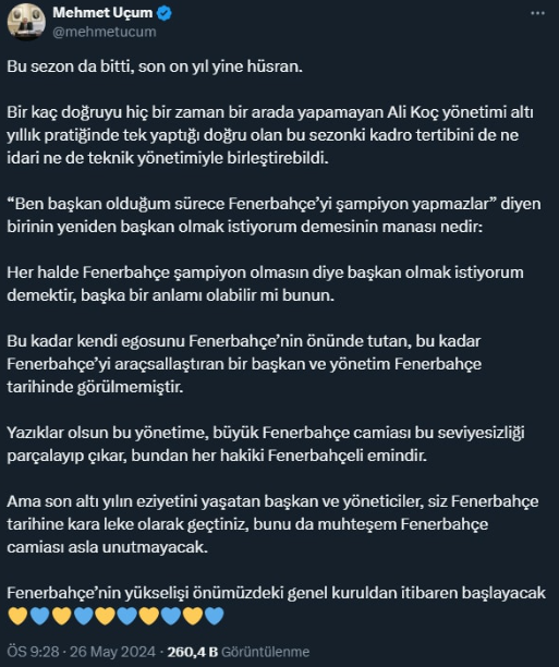 Fenerbahçe Başkanı Ali Koç’u hedefe koyan Uçum, “Yazıklar olsun bu yönetime, büyük Fenerbahçe camiası bu seviyesizliği parçalayıp çıkar, bundan her hakiki Fenerbahçeli emindir.” ifadelerini kullandı.
