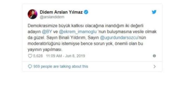 Gazeteci Didem Arslan Yılmaz, “Demokrasimize büyük katkısı olacağına inandığım iki değerli adayın Binali Yıldırım ve Ekrem İmamoğlu‘nun buluşmasına vesile olmak da güzel. Sayın Binali Yıldırım, Sayın Uğur Dündar’ın moderatörlüğünü istemişse bence sorun yok, önemli olan bu yayının yapılması” dedi.