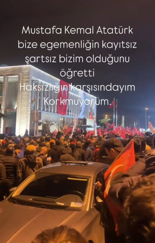 “Bugün gözaltına alınan sadece Ekrem İmamoğlu değildir. Bugün sabah saatlerinde gözaltına alınan 16 milyon İstanbullunun iradesidir. Bugün gözaltında olan hukuk devletidir, demokrasidir, adalettir. Size söz veriyorum, asla pes etmeyeceğiz, yolumuza devam edeceğiz. Alnımız ak başımız dik, bunca suçu, hukuksuzlukları, adaletsizlikleri kabullenmiyoruz. Kabullenirsek demokrasi ölür.”