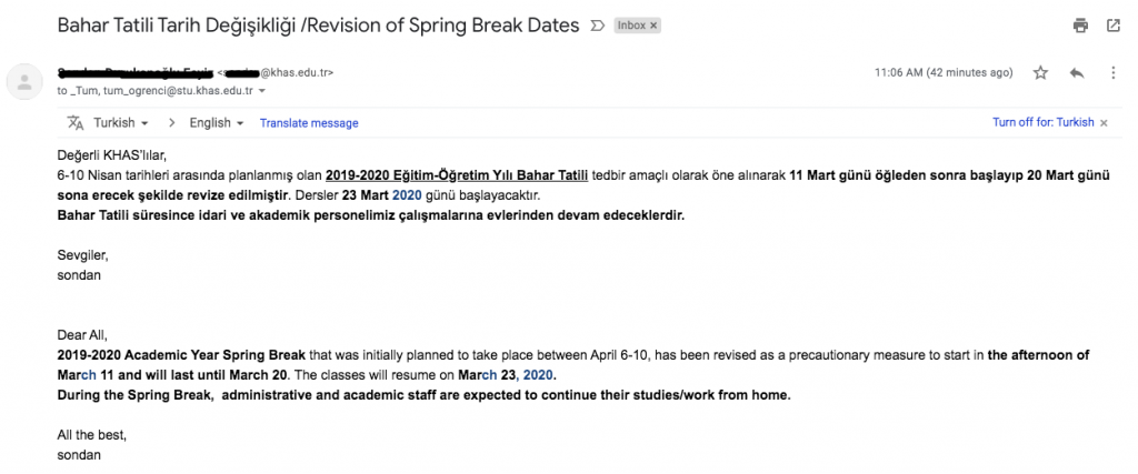Cumhuriyet’te yer alan habere göre;İstanbul Kadir Has Üniversitesi, Türkiye’de koronavirüs vakası görülmesinin ardından eğitime ara verdiğini duyurdu. Üniversite yönetiminin öğrenciler ve çalışanlarla paylaştığı e-posta’da, 6-10 Nisan arasında yapılacak bahar dönemi yarı yıl tatilinin, koronavirüs tedbiri nedeniyle bugün öğleden itibaren başlayarak 20 Mart’a kadar süreceği belirtildi.