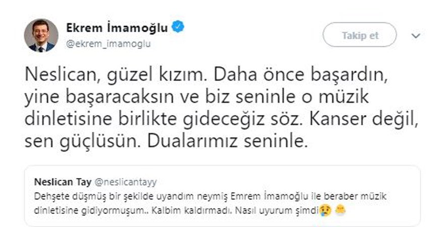 İstanbul Büyükşehir Belediye Başkanı Ekrem İmamoğlu, kanserle mücadele eden ve geçtiğimiz gün yoğun bakıma kaldırılan Neslican Tay’la ilgili duygusal bir mesaj paylaştı.