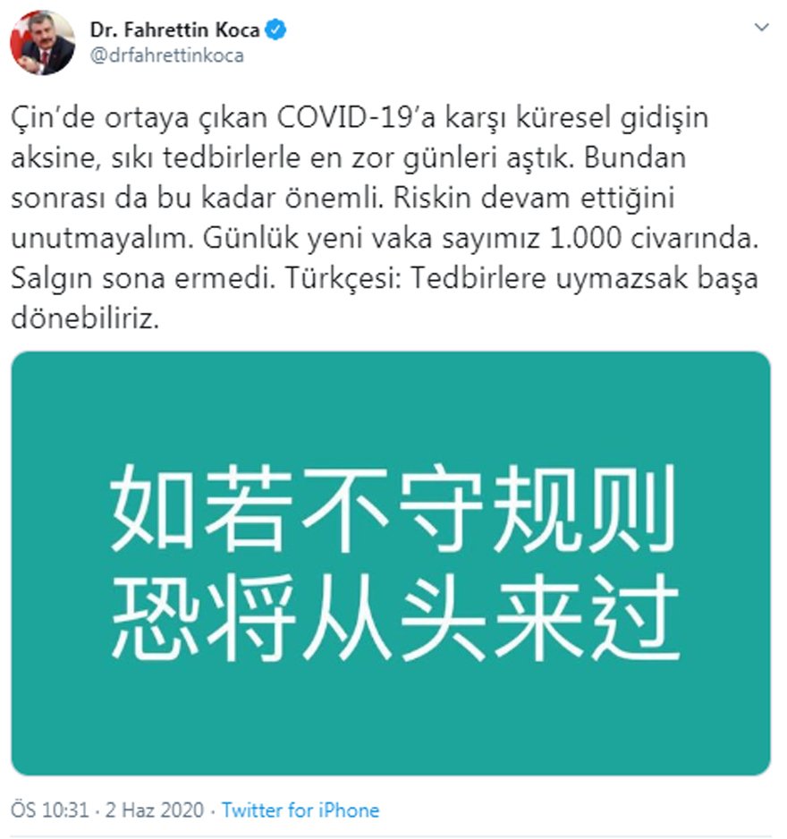 Çince bir paylaşım yapan Bakan Koca, “Türkçesi: Tedbirlere uymazsak başa dönebiliriz” dedi.
