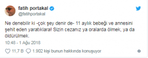 FOX TV Ana Haber sunucu Fatih Portakal, sosyal medya hesabı üzerinden, Hakkari’de PKK tarafından Nurcan Karakaya ile 11 aylık bebeği Mustafa Bedirhan Karakaya’nın şehit edilmesi olayına sert tepki gösterdi.
