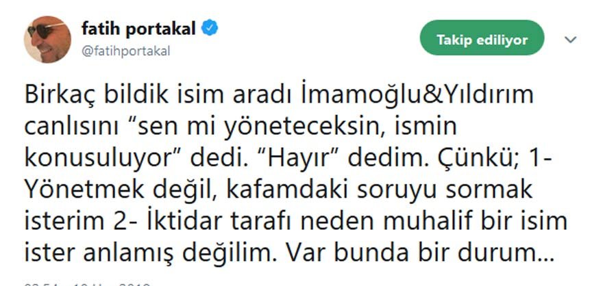 “Birkaç bildik isim aradı İmamoğlu&Yıldırım canlısını “sen mi yöneteceksin, ismin konusuluyor” dedi. “Hayır” dedim. Çünkü; 1- Yönetmek değil, kafamdaki soruyu sormak isterim 2- İktidar tarafı neden muhalif bir isim ister anlamış değilim. Var bunda bir durum…”