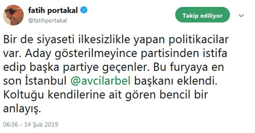 Handan Toprak’ın CHP’den istifa edip DSP’ye geçeceği haberi üzerine Portakal, “Bu furyaya en son İstanbul @avcilarbel başkanı eklendi. Koltuğu kendilerine ait gören bencil bir anlayış” yorumunda bulundu.
