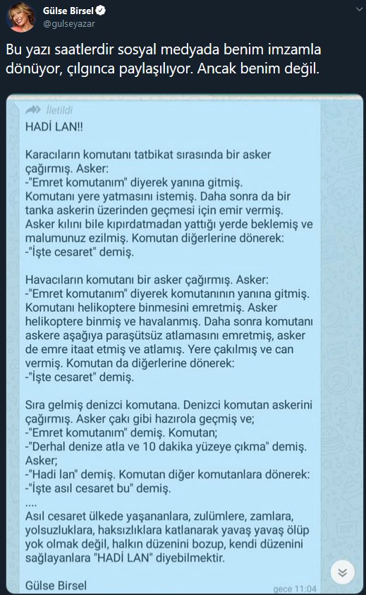 Kalemi kadar başarılı oyunculuğu ile de dikkatleri üzerine çeken ve bolca övgü alan Gülse Birsel, sosyal medya hesabını da aktif olarak kullanan bir isim. Durum böyle olunca da bazen hiç istemediği durumlarla karşı karşıya gelebiliyor. Hürriyet’teki görevinden istifa ettikten sonra tamamen dizi ve senaryo işleriyle ilgilenmeye başlayan Birsel, dün akşam saatlerinde paylaştığı bir yazı ile sevenlerini uyardı. Sosyal medyada, kendisinin kaleminden çıktığı iddiasıyla dolaşan bir metni yalanlayan Birsel, ‘Hadi Lan’ başlığını taşıyan yazıyla ilgili olarak şunları yazdı: