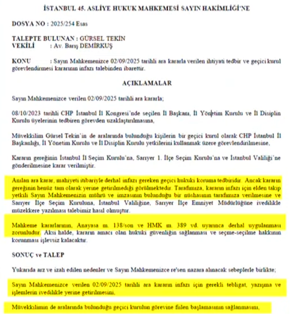 CHP’liler kayyum Gürsel Tekin’i binaya sokmamak için nöbetlerini sürdürürken Tekin mahkemeye başvurdu. Tekin, ‘Görevi yerine getirebilmem için kararın örneğini bana da verin” ifadelerini kullanarak mahkemeye başvurdu. CHP’ye kayyum tebligatı gitti.