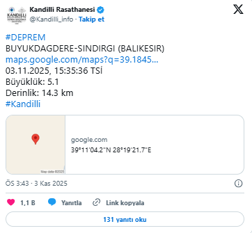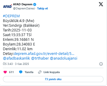 “Balıkesir ilimizin Sındırgı ilçesinde saat 15.35’de meydana gelen 4.9 büyüklüğündeki #deprem sonrası, an itibarıyla, olumsuz bir durum bulunmamaktadır. Saha tarama çalışmaları devam etmektedir.”