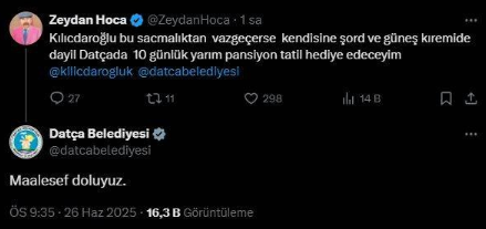 Sosyal medyadaki bir kullanıcının Kılıçdaroğlu’na “tatil hediye edeceğini” paylaşımına yanıt veren Datça Belediyesi’ni de etiketledi. Belediyesi, “Doluyuz” yanıtını vermişti.