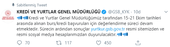Kurumdan yapılan açıklamada, “Kredi ve Yurtlar Genel Müdürlüğümüz tarafından 15-21 Ekim tarihleri arasında alınan burs/kredi başvuruları için değerlendirme süreci devam etmektedir. Sürecin ardından sonuçlar http://yurtkur.gsb.gov.tr resmi sitemizden ve resmi sosyal medya hesaplarımızdan duyurulacaktır.” denildi.