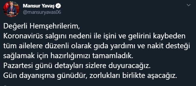Sosyal medya hesabından açıklama yapan Mansur Yavaş, ”Değerli Hemşehrilerim, koronavirüs salgını nedeni ile işini ve gelirini kaybeden tüm ailelere düzenli olarak gıda yardımı ve nakit desteği sağlamak için hazırlığımızı tamamladık. Pazartesi günü detayları sizlere duyuracağız. Gün dayanışma günüdür, zorlukları birlikte aşacağız” ifadelerini kullandı.