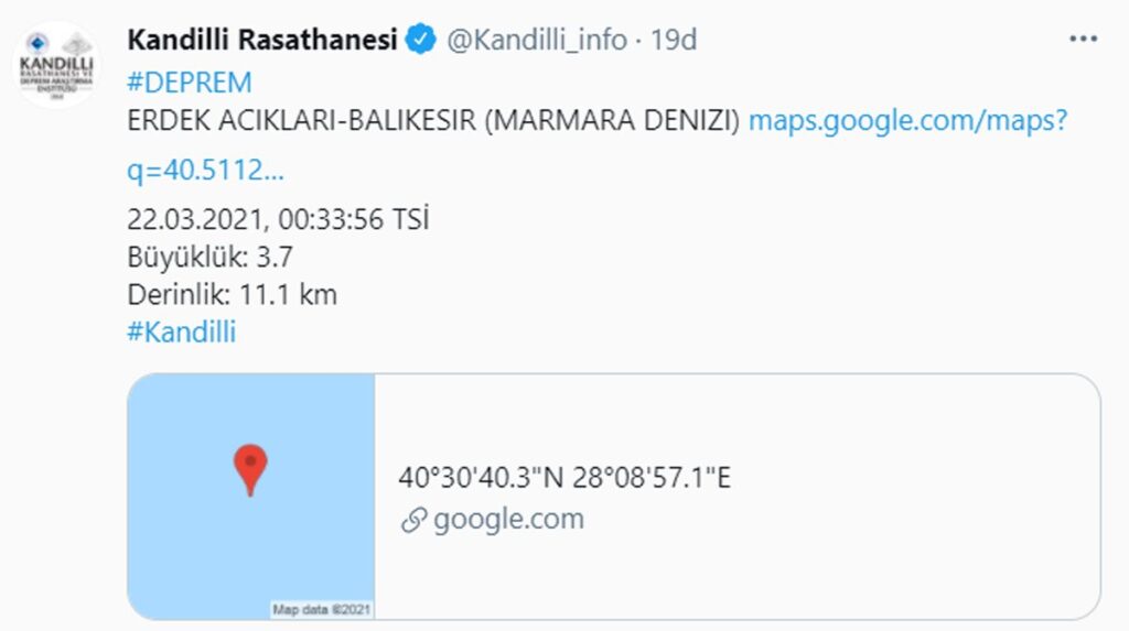 Kandilli Rasathanesi’nden yapılan açıklamaya göre 3.7 büyüklüğündeki deprem Balıkesir’in Erdek ilçesi açıklarında oldu.
