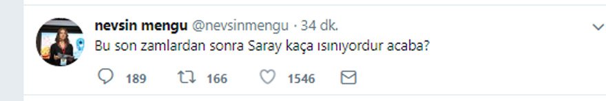 Nevşin Mengü, doğalgaza yapılan zamları Twitter hesabından eleştirdi. Mengü, “Bu son zamlardan sonra Saray kaça ısınıyordur acaba?” diye sordu.