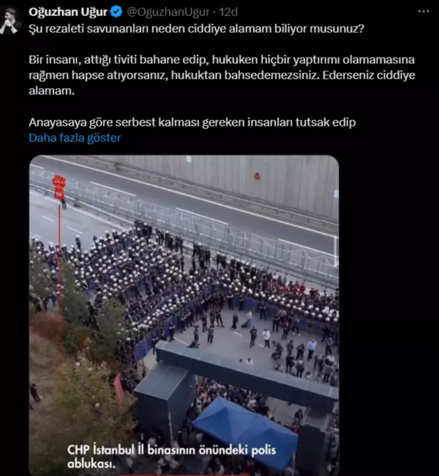 Polisin il binası çevresinde olduğu görüntüleri paylaşan Uğur “Şu rezaleti savunanları neden ciddiye alamam biliyor musunuz?” diyerek şunları yazdı: