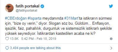 “#CBErdoğan #Isparta meydanında #31Mart’ta istikrarın sürmesi için, “bize oy verin,” diyor. Slogan söz bu. Güldüm… Enflasyon, işsizlik, faiz, pahallılık, durgunluk ve sistemsizlik istikrarlı şekilde yüksek seyrediyor. İstikrardan kastedilen acaba ne ki?”