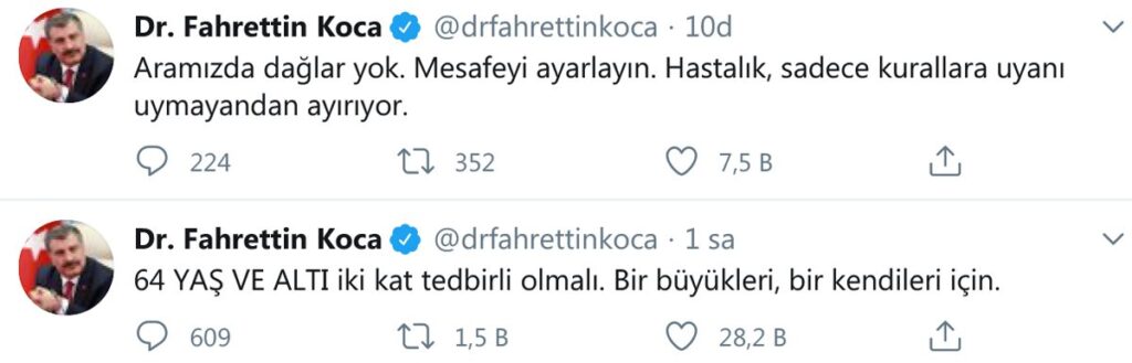 Bakan Koca, yeni paylaşımında ise “Aramızda dağlar yok. Mesafeyi ayarlayın. Hastalık, sadece kurallara uyanı uymayandan ayırıyor” ifadelerini kullanarak vatandaşlara sosyal mesafe konusunda uyarıda bulundu.