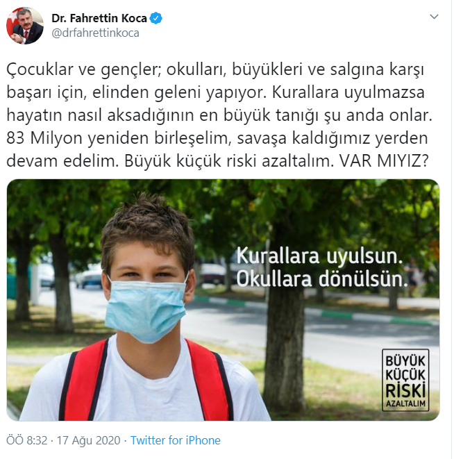 “Çocuklar ve gençler, okulları, büyükleri ve salgına karşı başarı için elinden geleni yapıyor. Kurallara uyulmazsa hayatın nasıl aksadığının en büyük tanığı şu anda onlar. 83 milyon yeniden birleşelim, savaşa kaldığımız yerden devam edelim. Büyük küçük riski azaltalım. Var mısınız?”