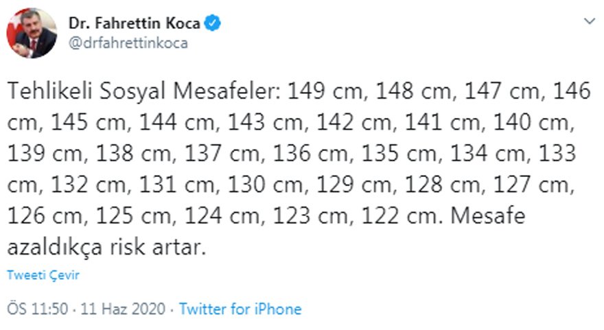 Paylaşımında sosyal mesafeye dikkat çeken Bakan Koca, “Mesafe azaldıkça risk artar” ifadelerini kullandı.