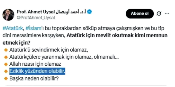 Profesör Uysal, Kocaeli Müftülüğü’nün 10 Kasım’daki mevlidini eleştirerek “Atatürk İslam’ı bu topraklardan söküp atmaya çalışmışken ve bu tip dini merasimlere karşıyken, Atatürk için mevlit okutmak kimi memnun etmek için?” ifadelerini kullandı.
