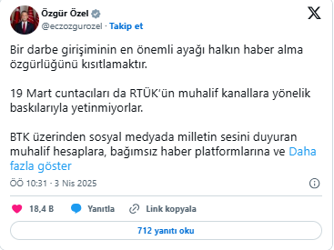 CHP lideri Özel, X’te hesaplara erişim engeli getirilmesinin ardından yaptığı açıklamada, “Bu güne kadar yüzlerce sayfayı “nasıl olsa anlaşılmaz” diyerek kapattığınızı biliyoruz. Siz bugün antidemokratik uygulamalara alet olursanız, erişim engeli taleplerini uygularsanız bu millet size ne yapar iyi düşünün!” ifadelerini kullandı.