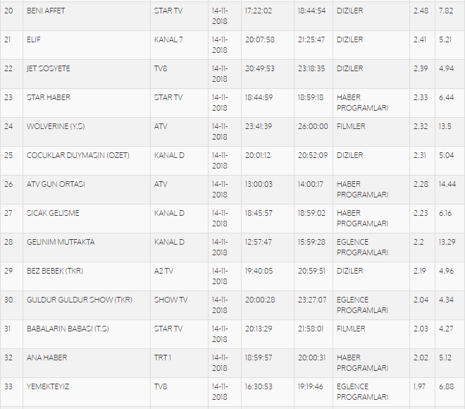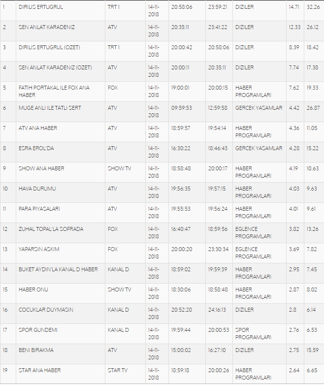 14 Kasım reyting sonuçları belli oldu. Diriliş Ertuğrul, geçen yıl kaybettiği liderliği geçen hafta kazanmıştı ve reyting sıralamasında bu hafta da en üst sırada yer aldı. Sen Anlat Karadeniz total reytinglerde ikinci olurken, Jet Sosyete ise yirmi ikinci sırada yer aldı.