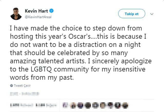 Twitter’dan yaptığı açıklamada “Bu yıl düzenlenecek olan Oscar Ödül Töreni’nin sunuculuğunu yapmaktan vazgeçtim çünkü bir çok yetenekli sanatçı tarafından kutlanması gereken gecede dikkat dağıtmak istemiyorum. Geçmişte LGBTQ için kullandığım duyarsız kelimeler için içtenlikle özür dilerim” sözlerini kullandı.