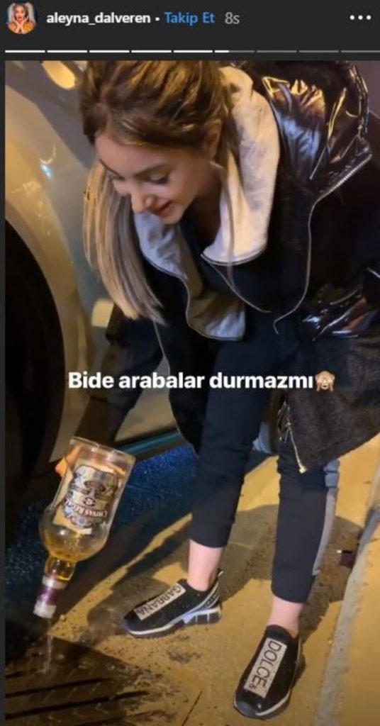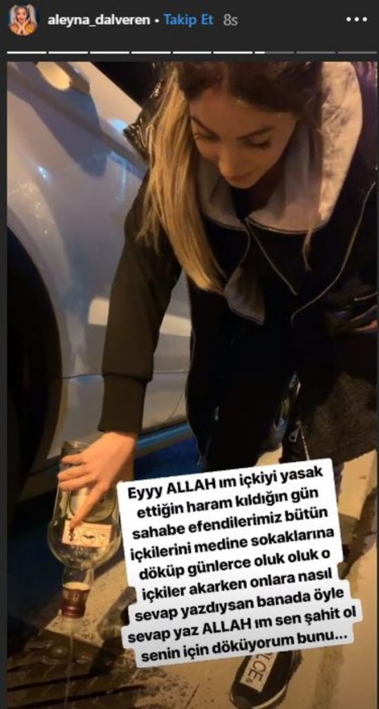 Aleyna Dalveren daha sonra ise kendisine gelen hediye içkiyi sokakta kanalizasyona döktü. O anları da hesabından yayınlayan Dalveren “Ey Allah’ım içkiyi yasak kıldığın gün sahabe efendilerimiz bütün içkilerini Medine sokaklarına döküp günlerce oluk oluk o içkiler akarken onlara nasıl sevap yazdıysan bana da öyle sevap yaz Allah’ım sen şahit ol senin için döküyorum bunu” yazdı.