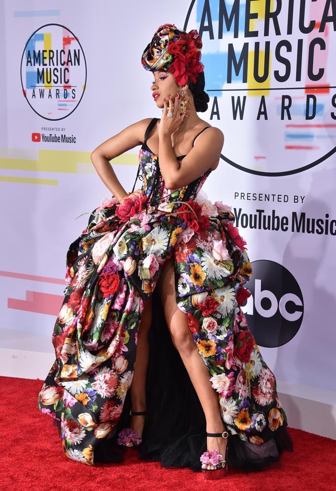Cardi B, korse detaylı, çiçekli elbisesiyle ve baştan ayağa çiçeklerden oluşan stiliyle çarpıcı bir görünüm elde etmiş.