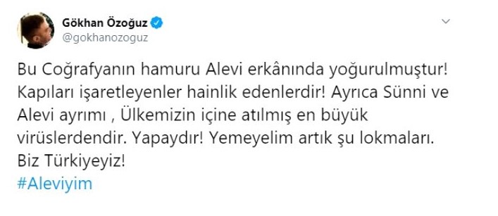 Twitter hesabından konuyla alakalı paylaşım yapan Gökhan Özoğuz, Twitter’da başlatılan “Aleviyim” etiketi altında “Bu Coğrafyanın hamuru Alevi erkânında yoğurulmuştur! Kapıları işaretleyenler hainlik edenlerdir! Ayrıca Sünni ve Alevi ayrımı, ülkemizin içine atılmış en büyük virüslerdendir. Yapaydır! Yemeyelim artık şu lokmaları. Biz Türkiyeyiz!” dedi.