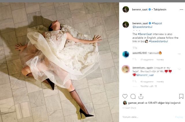 Arasının bozuk olduğu eşi Kenan Doğulu ile çıktığı Amerika tatilinden kısa bir süre önce dönen Beren Saat, Based İstanbul dergisi için çok konuşulacak pozlar verdi. Beyaz elbisesinin eteklerini açarak yerde yatıp poz veren Saat’in fotoğrafını görenler ise “İç çamaşırı giymemiş mi?” yorumunu yaptı. Başrol oynadığı Atiye dizisinin yayınlanması için adeta gün sayan oyuncu, verdiği cüretkar pozlarla herkesi şaşırttı. Saat, pozlardan birini de Instagram hesabından yayınladı. Saat, beyaz gelinliği andıran bir elbisenin altına siyah tül çorap ve siyah topuklu ayakkabı giydi. Yere yatarak elbisesinin eteklerini açıp poz veren Saat’in paylaşımını görenler ise “İç çamaşırı giymemiş mi?” sorusunu sordu.