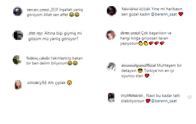 Dikkat çeken pozuyla kısa sürede binlerce yorum alan Saat’i eleştirenlerin yanı sıra övgü yağdıranlar da oldu. Beren Saat’in yaklaşık 140 bin beğeni alan fotoğrafı için şu yorumlar yapıldı:
