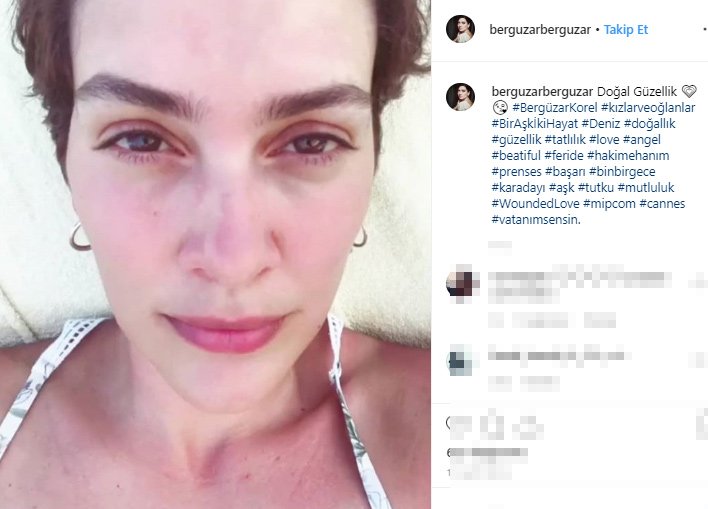 Tatile çıkan oyuncu Bergüzar Korel sosyal medya hesabından makyajsız fotoğrafını paylaşarak takipçilerinin beğenisine sundu. Oyuncunun doğal hali dakikalar içerisinde binlerce beğeni ve yorum aldı.